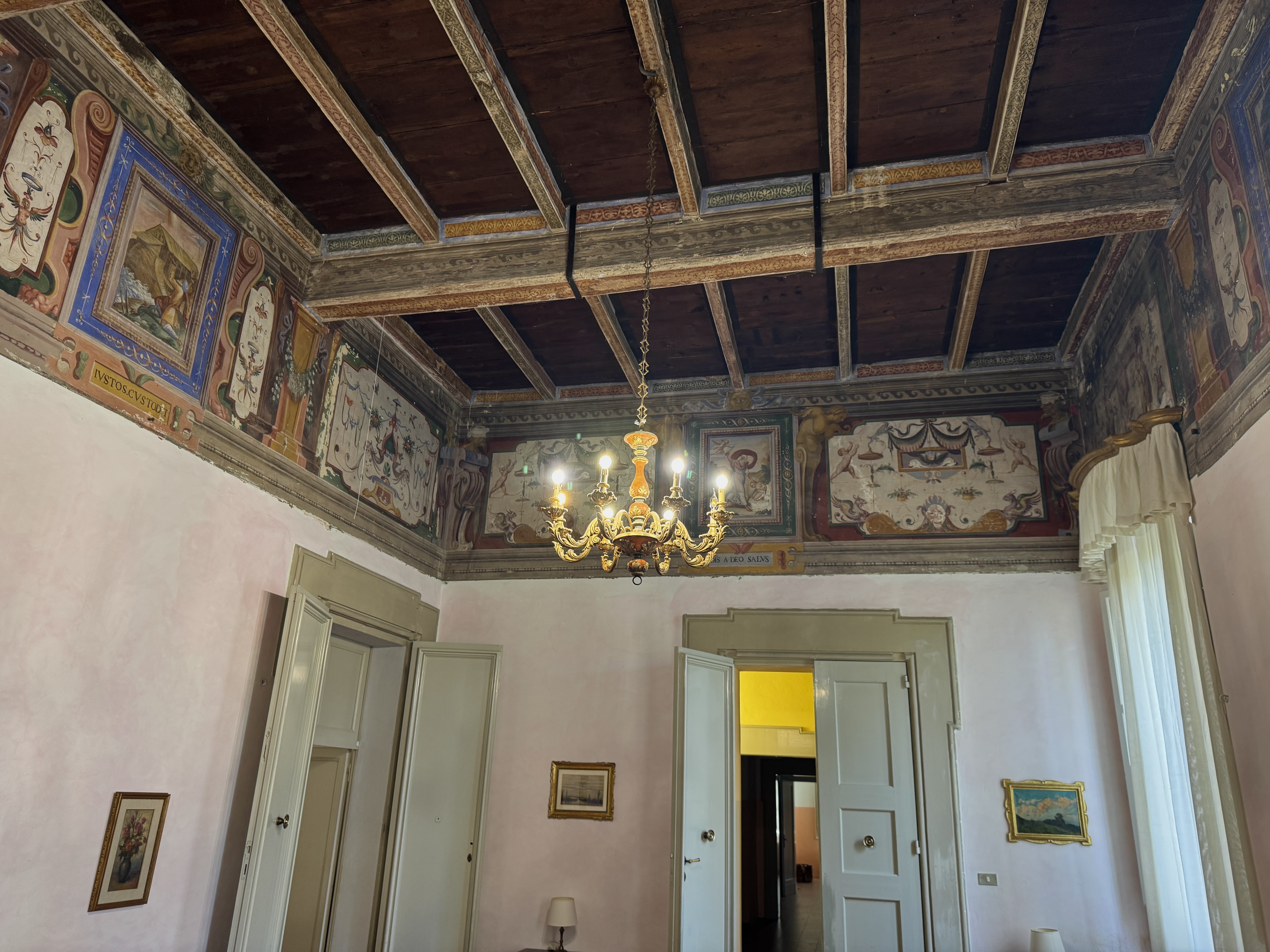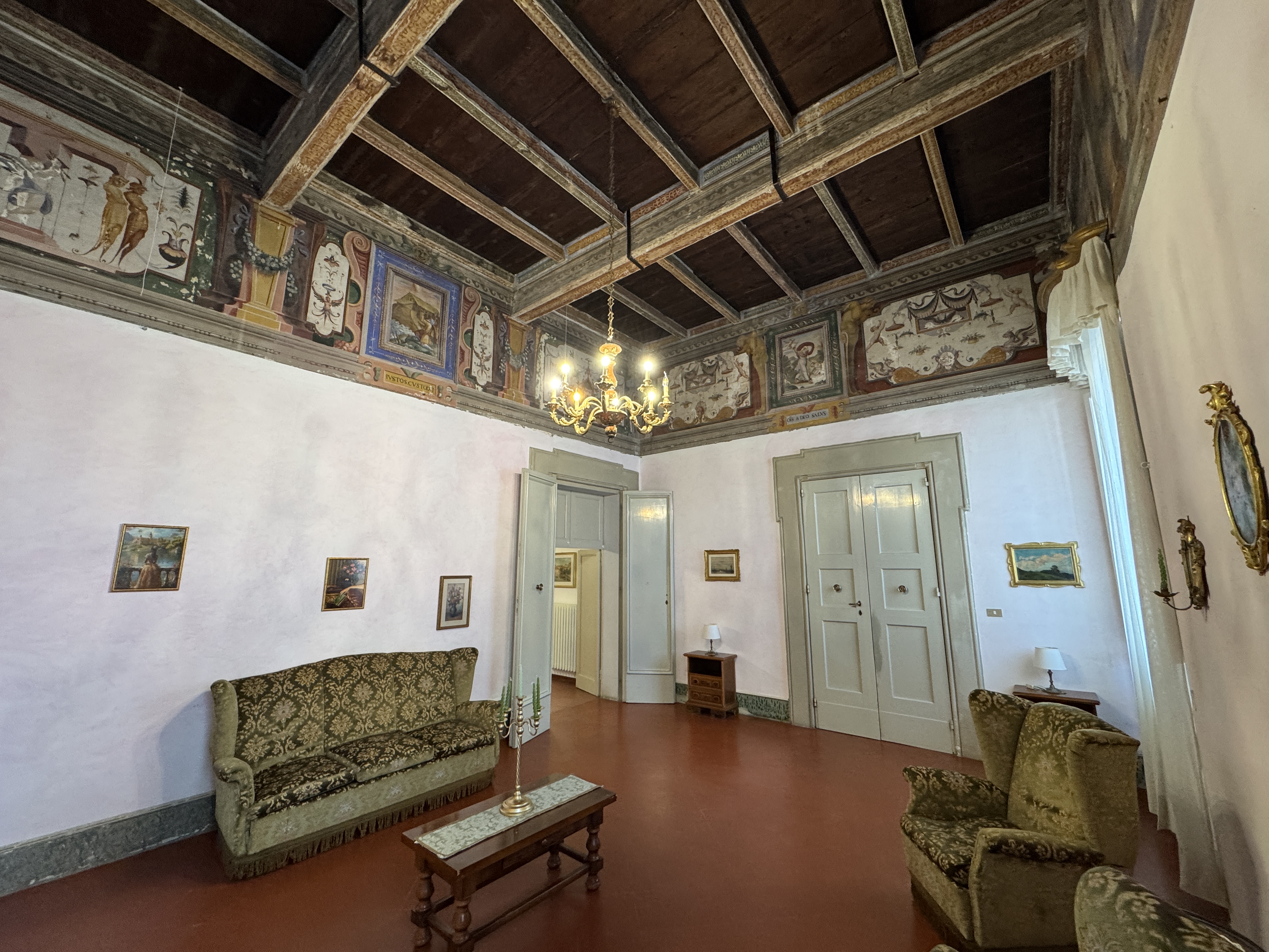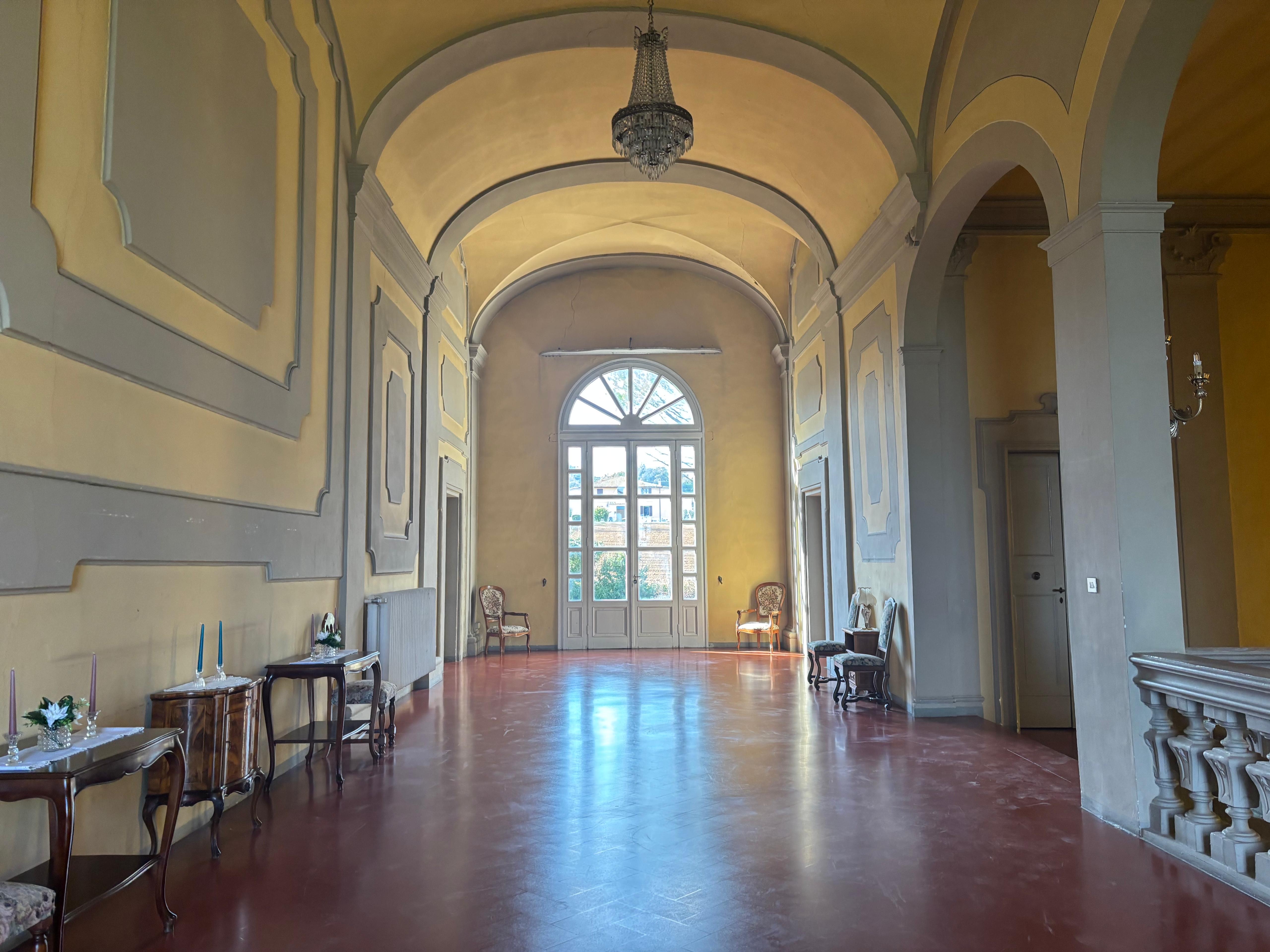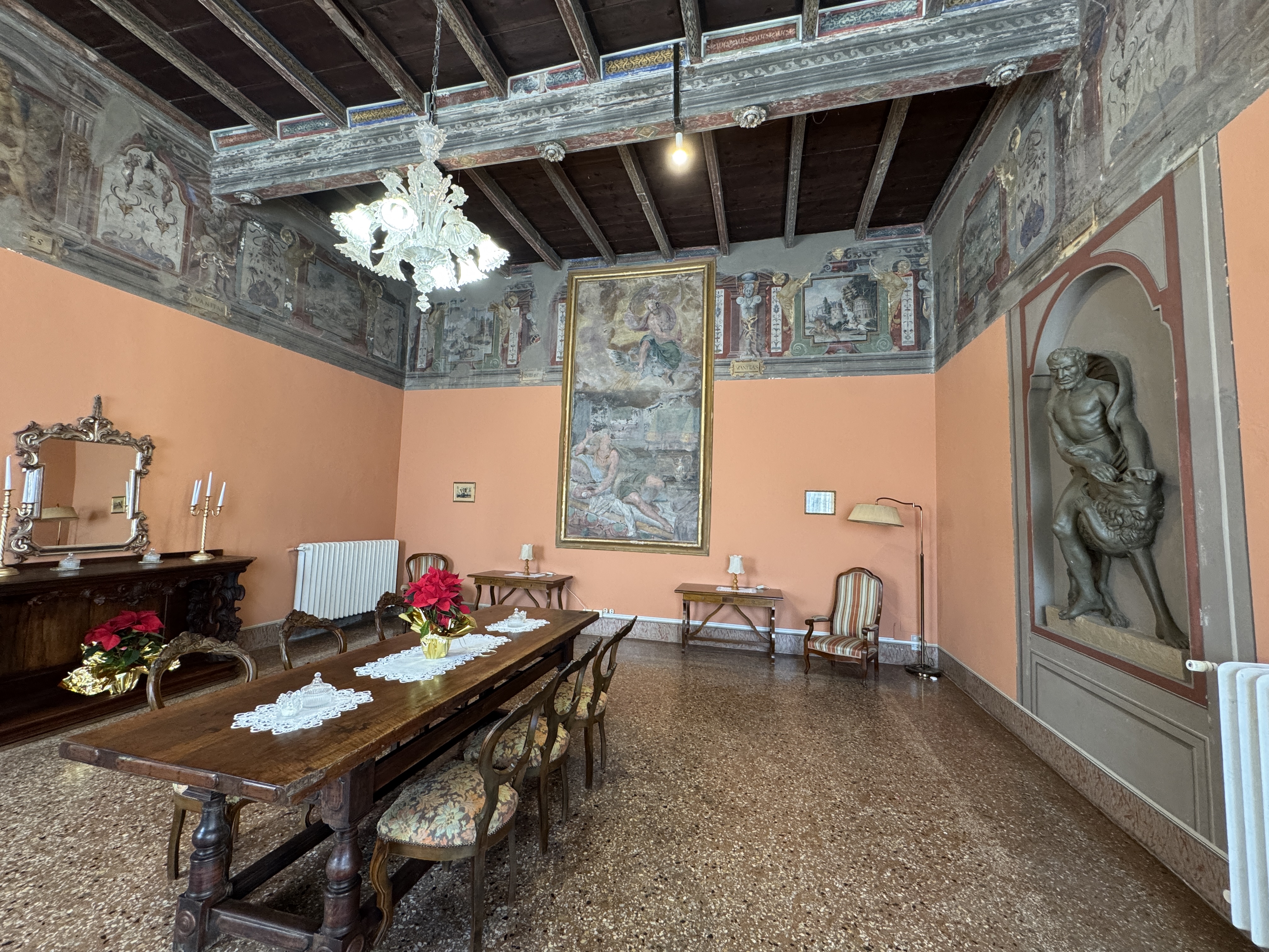 GLI INTERNI CONSERVANO AFFRESCHI, STUCCHI E APPARATI DECORATIVI ORIGINALI DI NOTEVOLE PREGIO. DI PARTICOLARE RILIEVO LA PRESENZA DI UNA CAPPELLA PRIVATA, IMPREZIOSITA DA UN DIPINTO MURALE ATTRIBUITO A CALVAERT, CHE CONFERISCE ALL’AMBIENTE UN’ATMOSFERA INTIMA E SOLENNE.