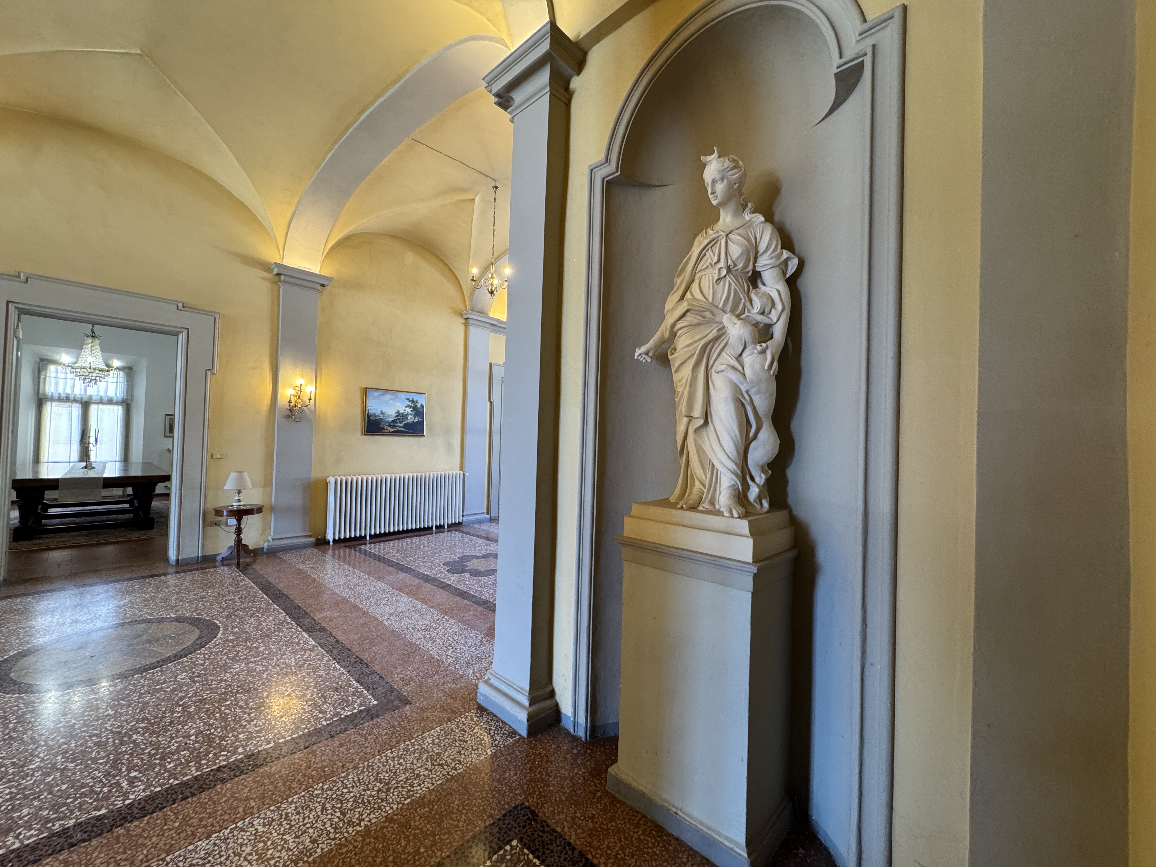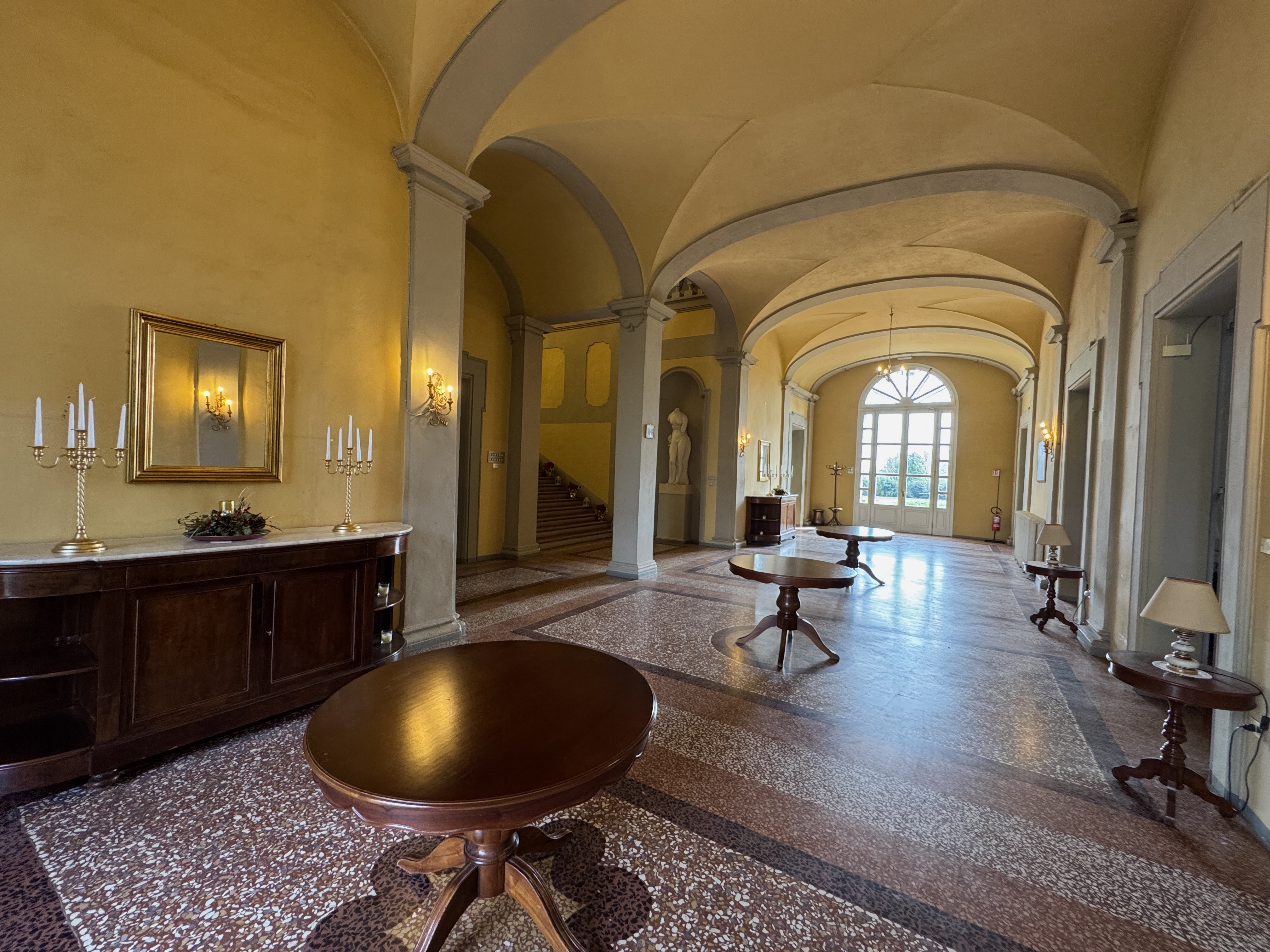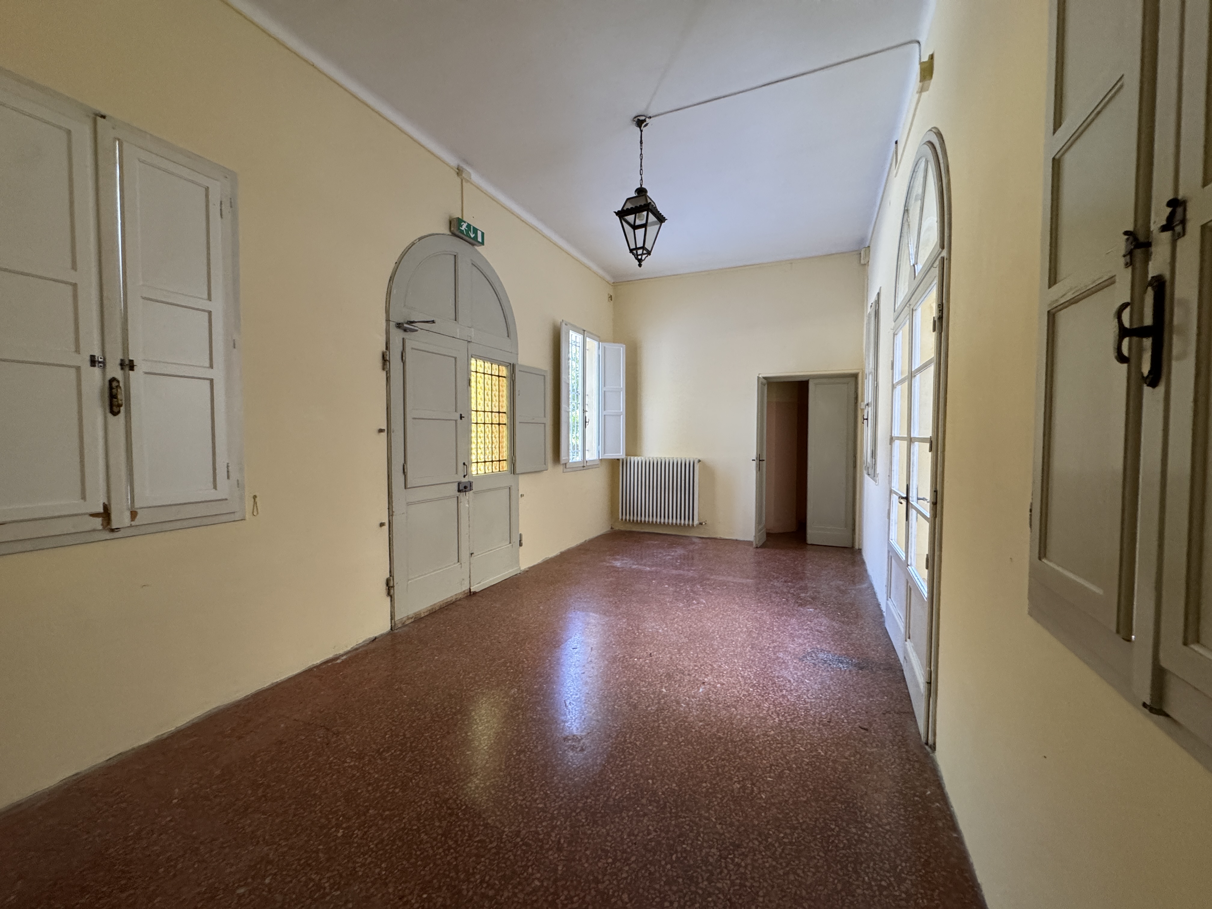 GLI INTERNI CONSERVANO AFFRESCHI, STUCCHI E APPARATI DECORATIVI ORIGINALI DI NOTEVOLE PREGIO. DI PARTICOLARE RILIEVO LA PRESENZA DI UNA CAPPELLA PRIVATA, IMPREZIOSITA DA UN DIPINTO MURALE ATTRIBUITO A CALVAERT, CHE CONFERISCE ALL’AMBIENTE UN’ATMOSFERA INTIMA E SOLENNE.