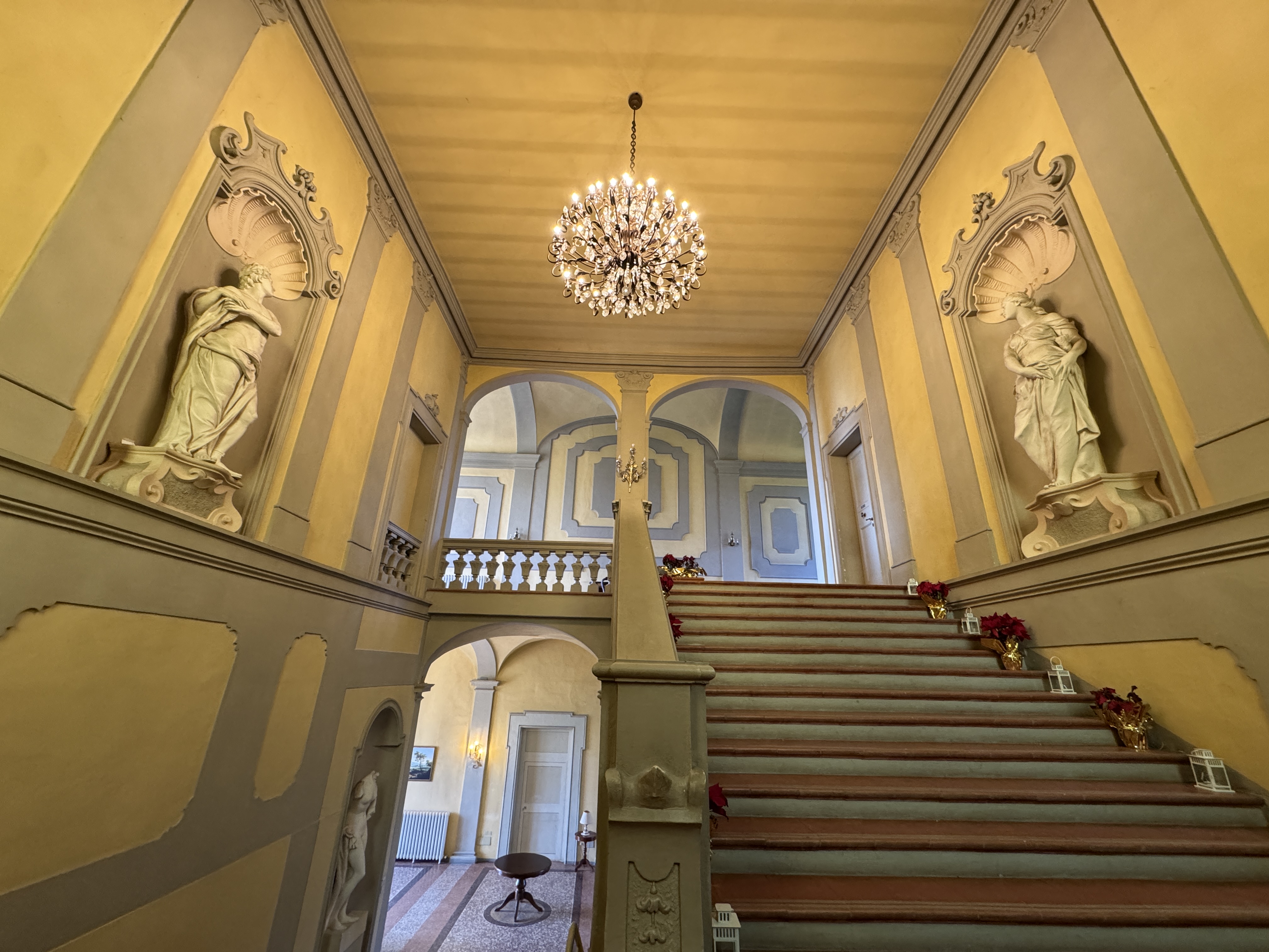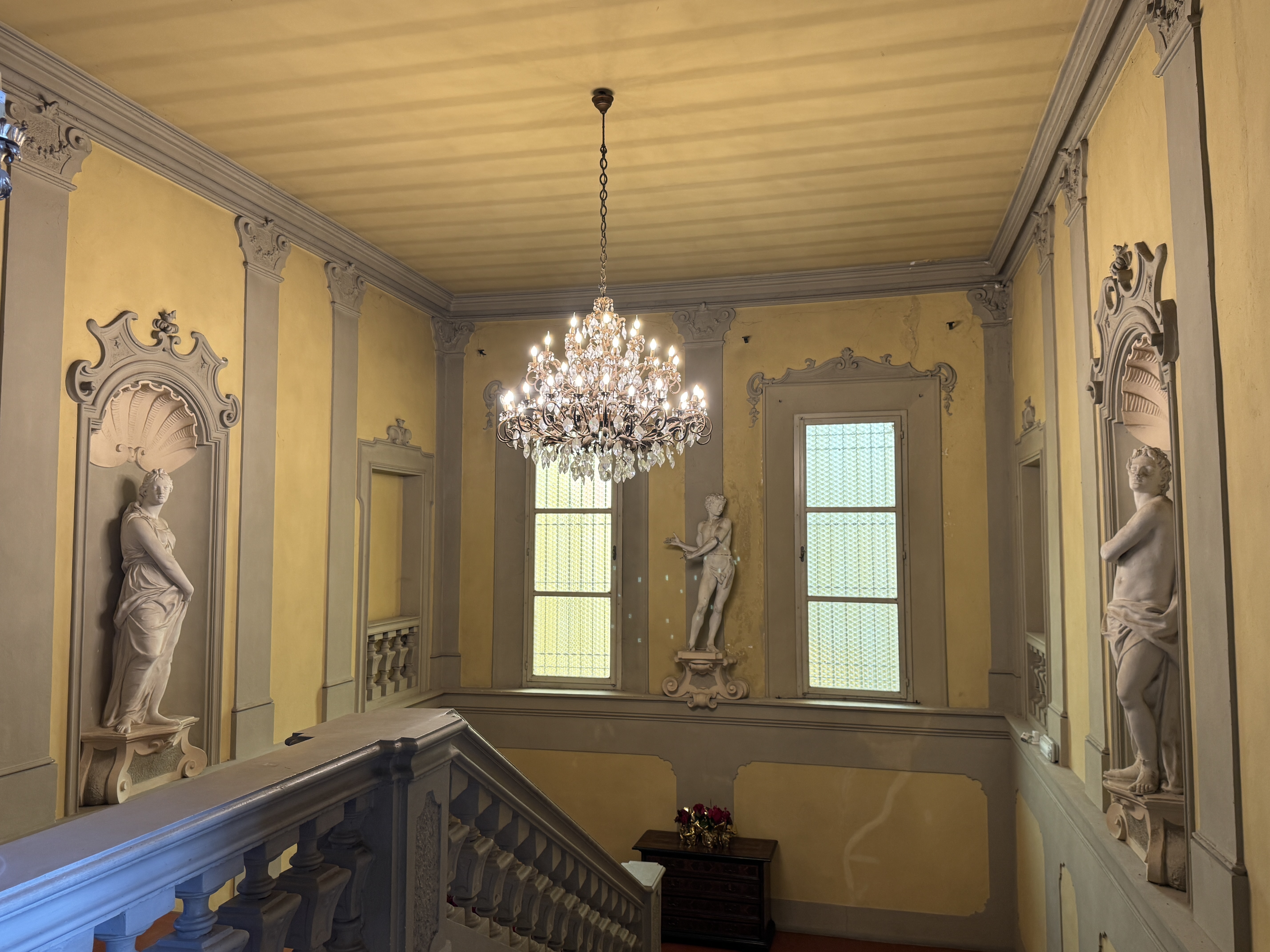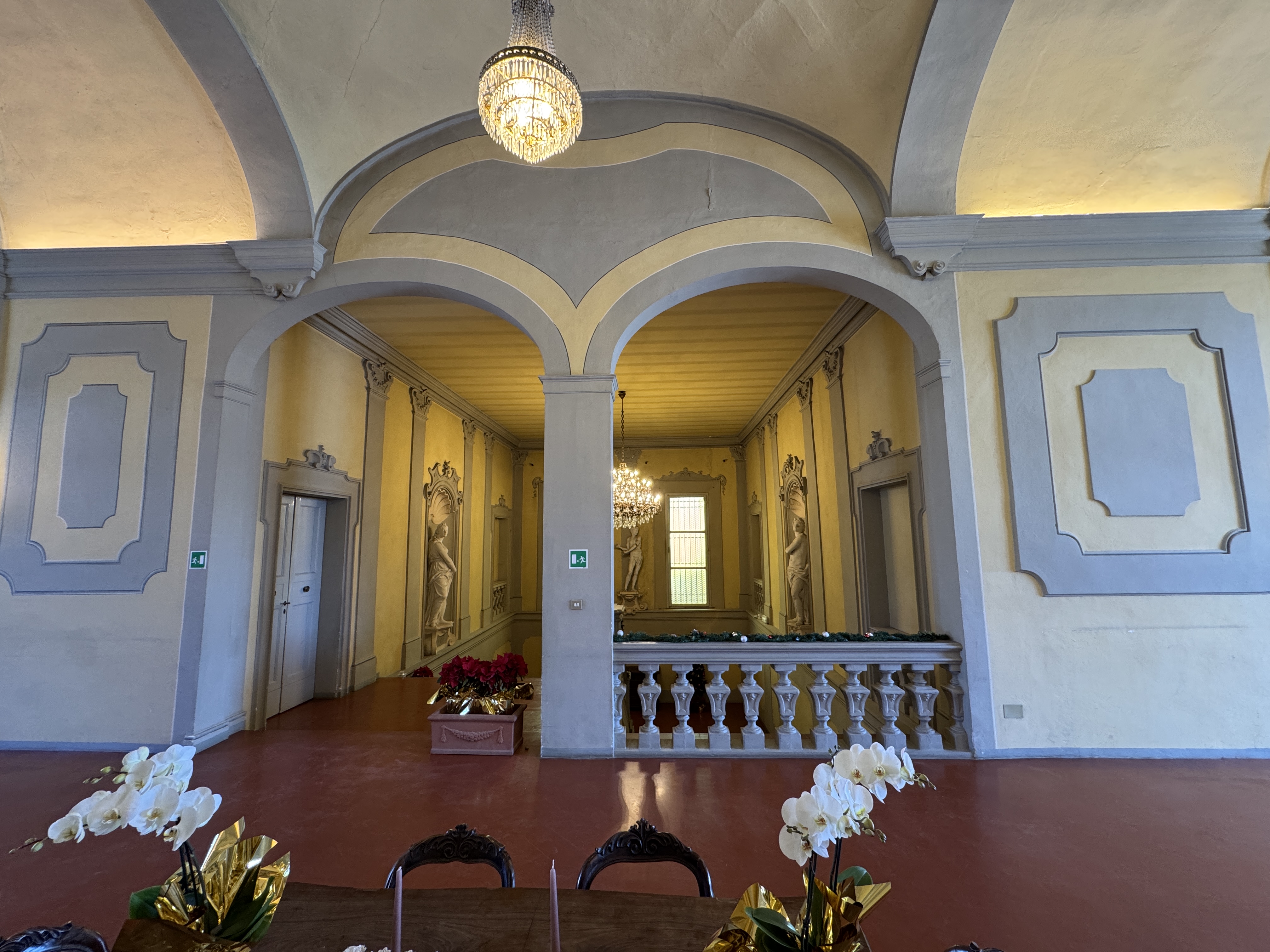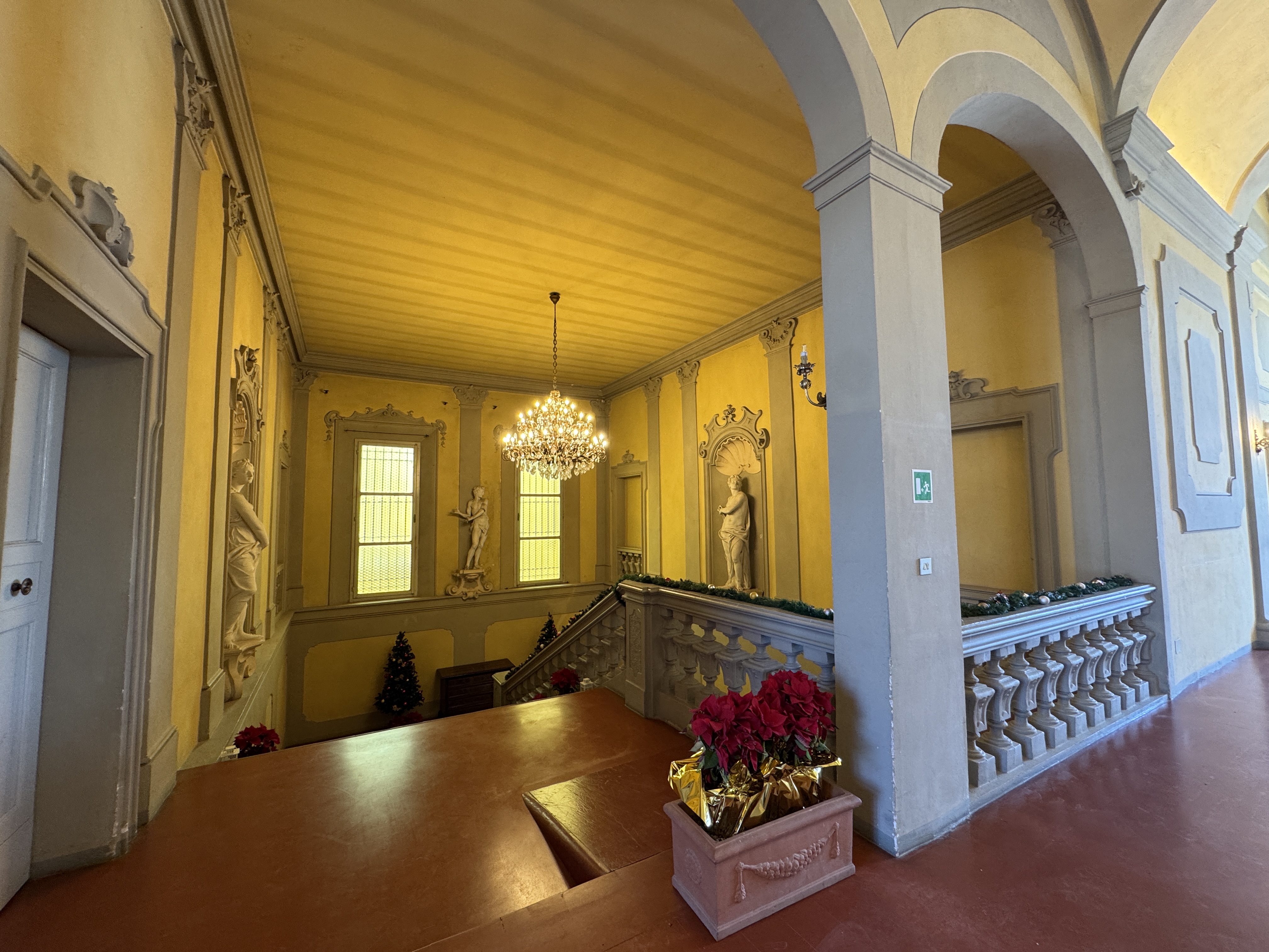 GLI INTERNI CONSERVANO AFFRESCHI, STUCCHI E APPARATI DECORATIVI ORIGINALI DI NOTEVOLE PREGIO. DI PARTICOLARE RILIEVO LA PRESENZA DI UNA CAPPELLA PRIVATA, IMPREZIOSITA DA UN DIPINTO MURALE ATTRIBUITO A CALVAERT, CHE CONFERISCE ALL’AMBIENTE UN’ATMOSFERA INTIMA E SOLENNE.