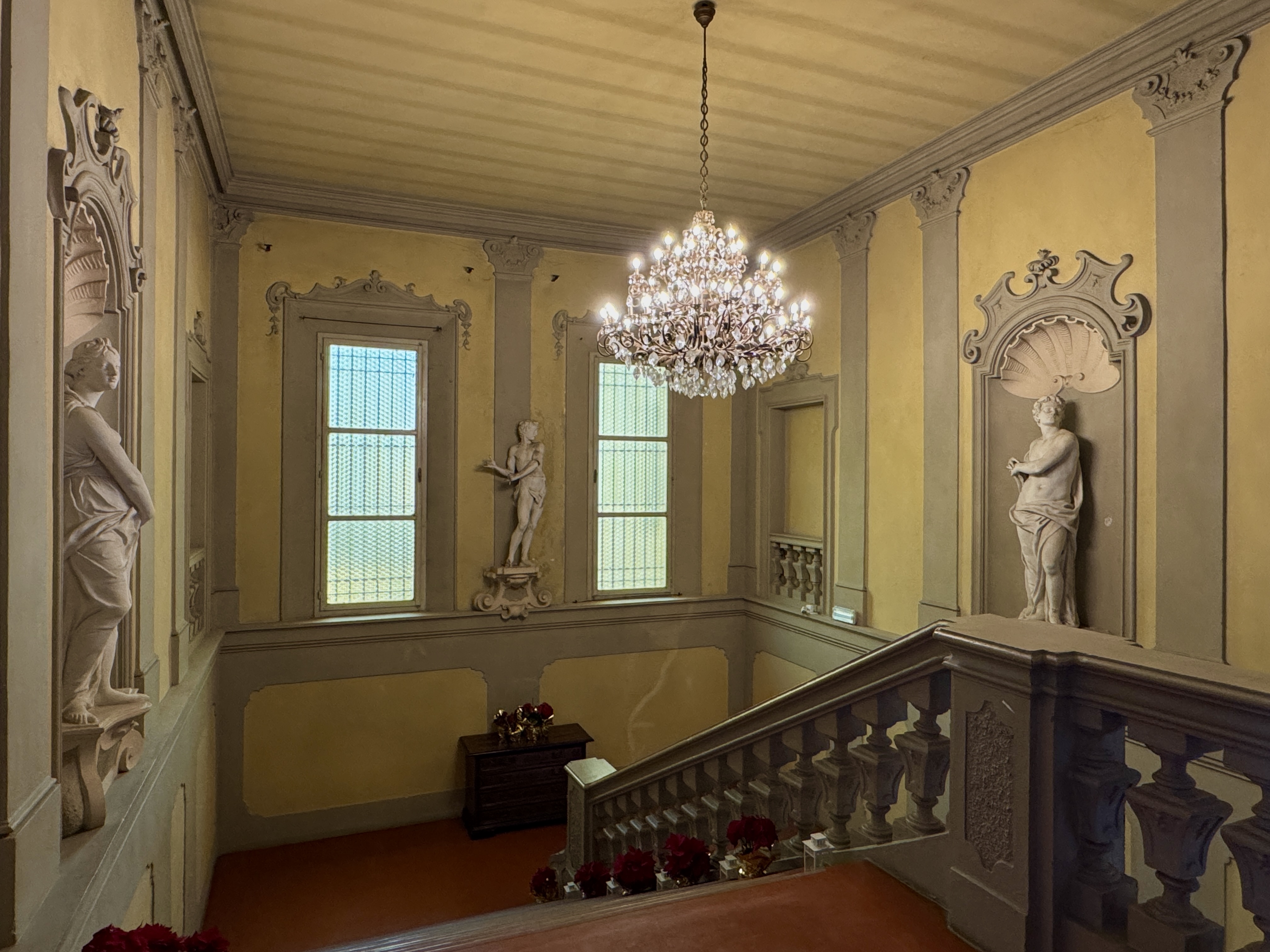 ELEMENTO CENTRALE DELLA VILLA È LA MAESTOSA SCALA MONUMENTALE, ARRICCHITA DA STATUE IN STUCCO, CHE COLLEGA ARMONIOSAMENTE I DIVERSI LIVELLI DELLA RESIDENZA. PORTALI IN COTTO, BALCONCINI DECORATIVI, LOGGE E BALLATOI CONTRIBUISCONO A CREARE UN INSIEME ARCHITETTONICO DI FORTE IMPATTO VISIVO E GRANDE COERENZA STILISTICA.