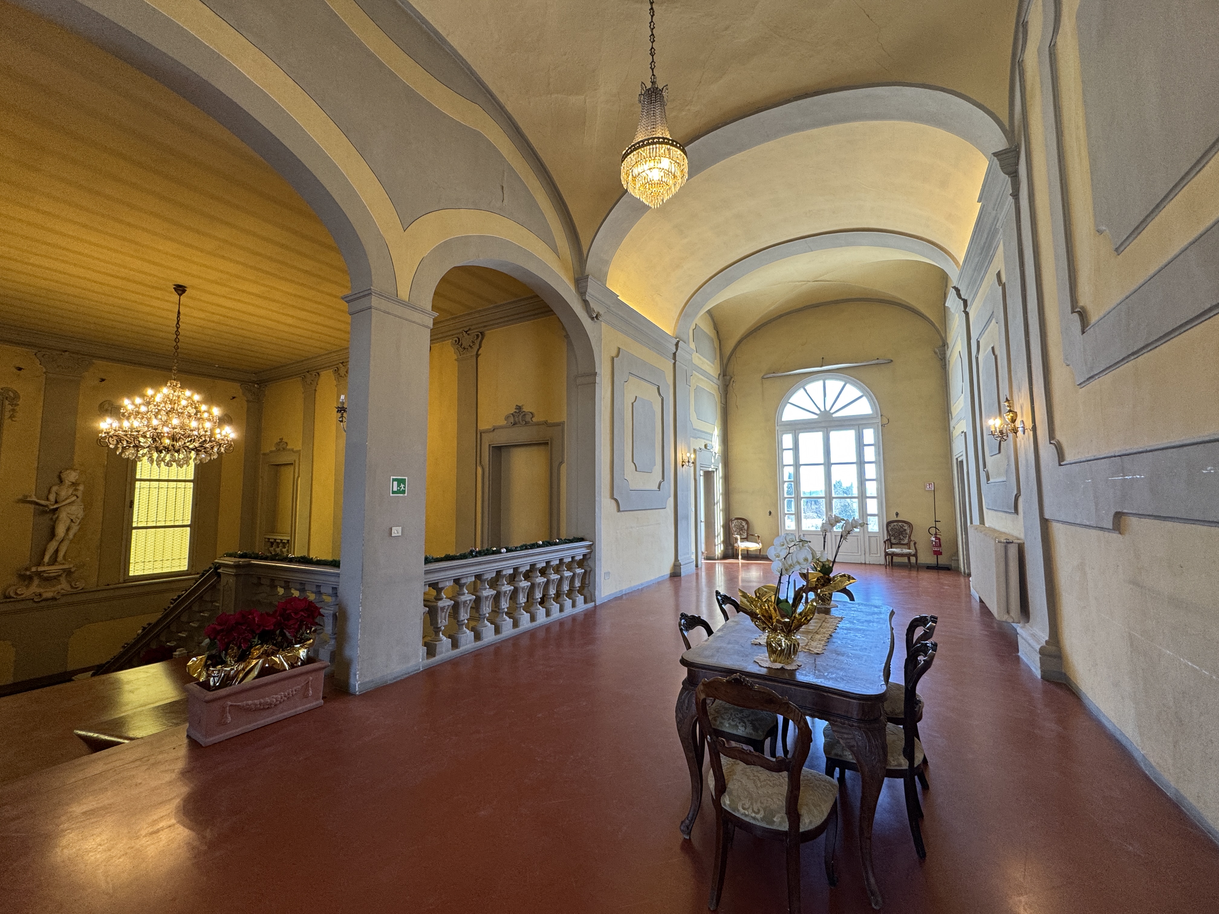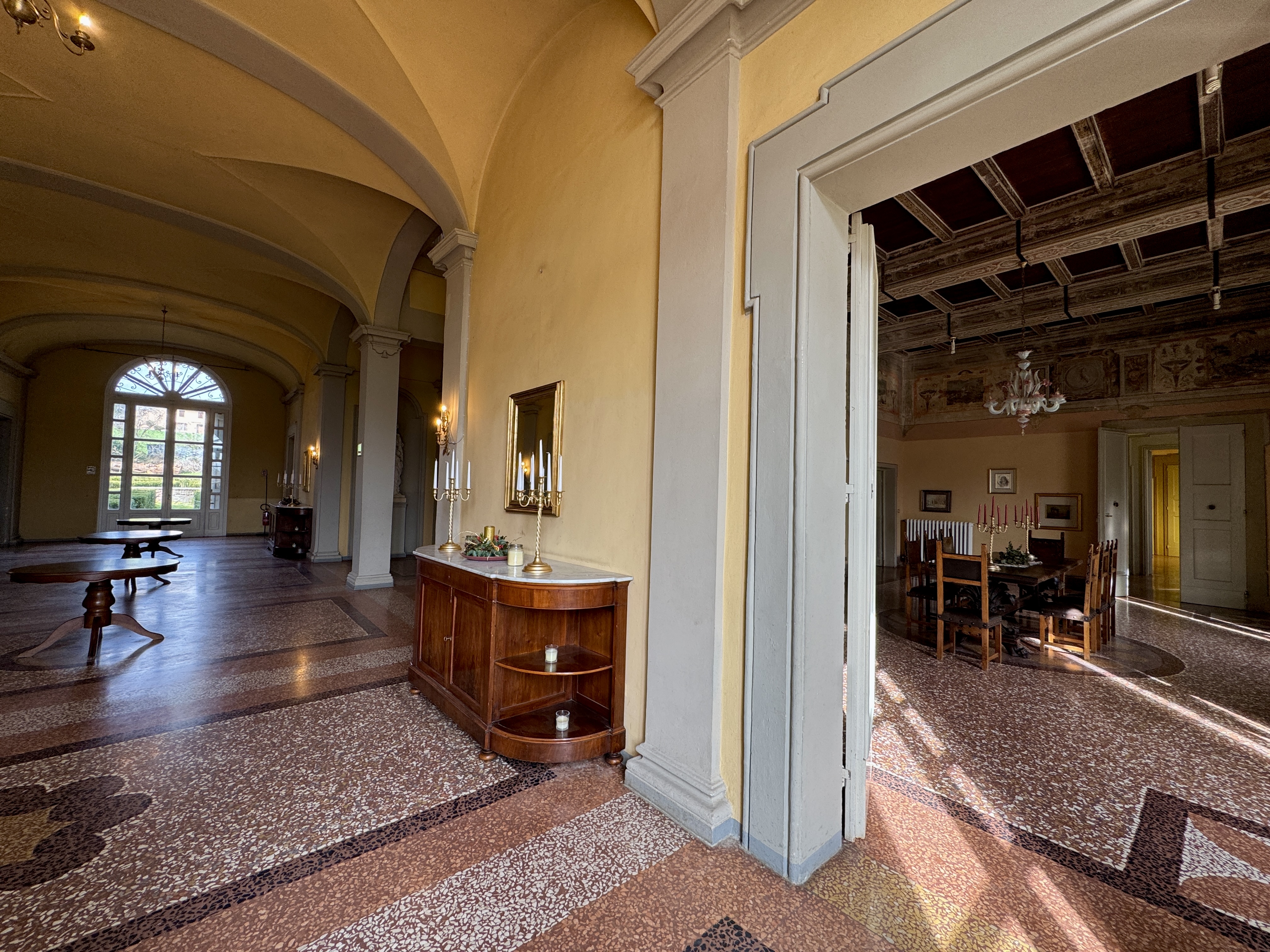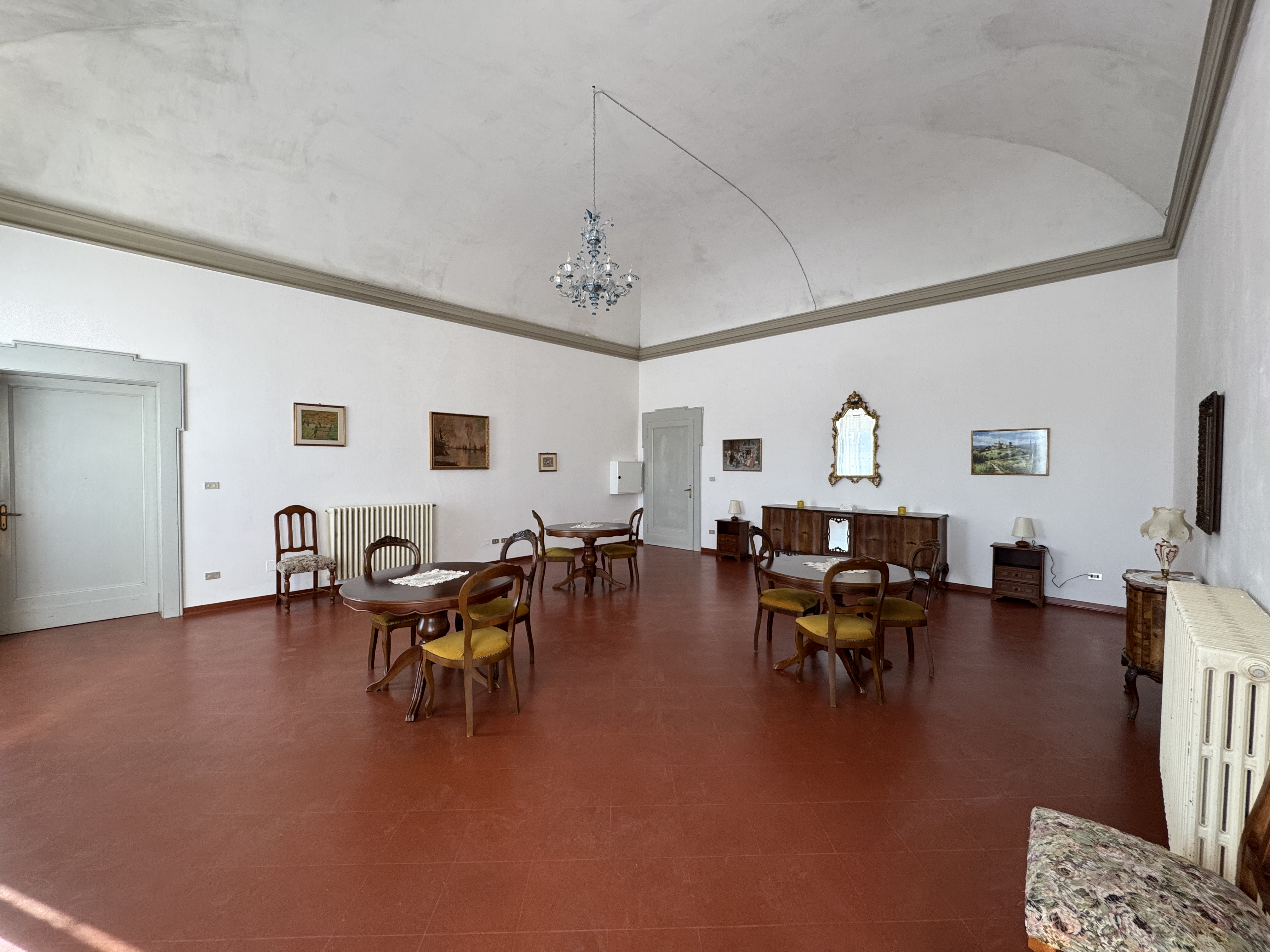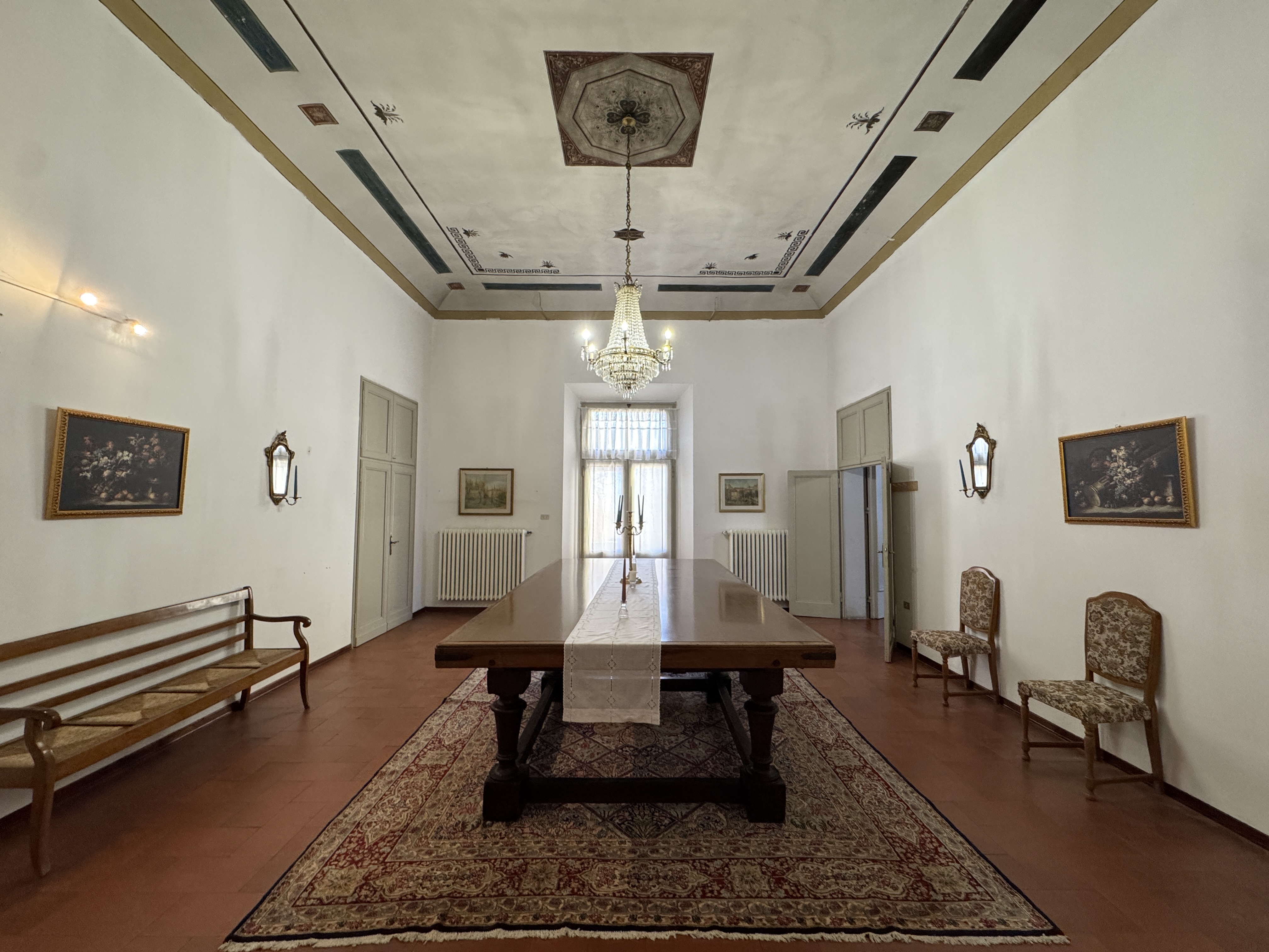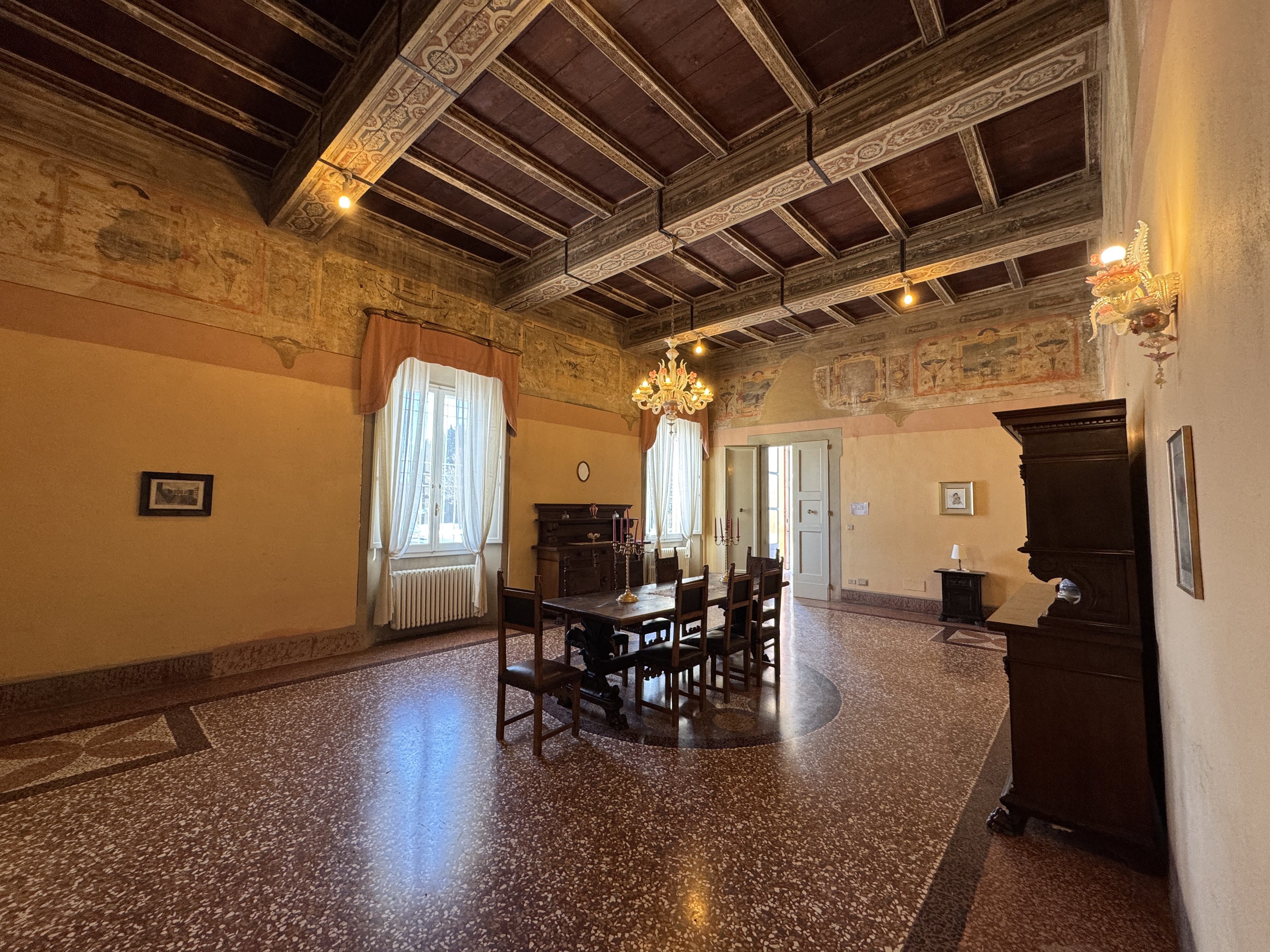 GLI INTERNI CONSERVANO AFFRESCHI, STUCCHI E APPARATI DECORATIVI ORIGINALI DI NOTEVOLE PREGIO. DI PARTICOLARE RILIEVO LA PRESENZA DI UNA CAPPELLA PRIVATA, IMPREZIOSITA DA UN DIPINTO MURALE ATTRIBUITO A CALVAERT, CHE CONFERISCE ALL’AMBIENTE UN’ATMOSFERA INTIMA E SOLENNE.