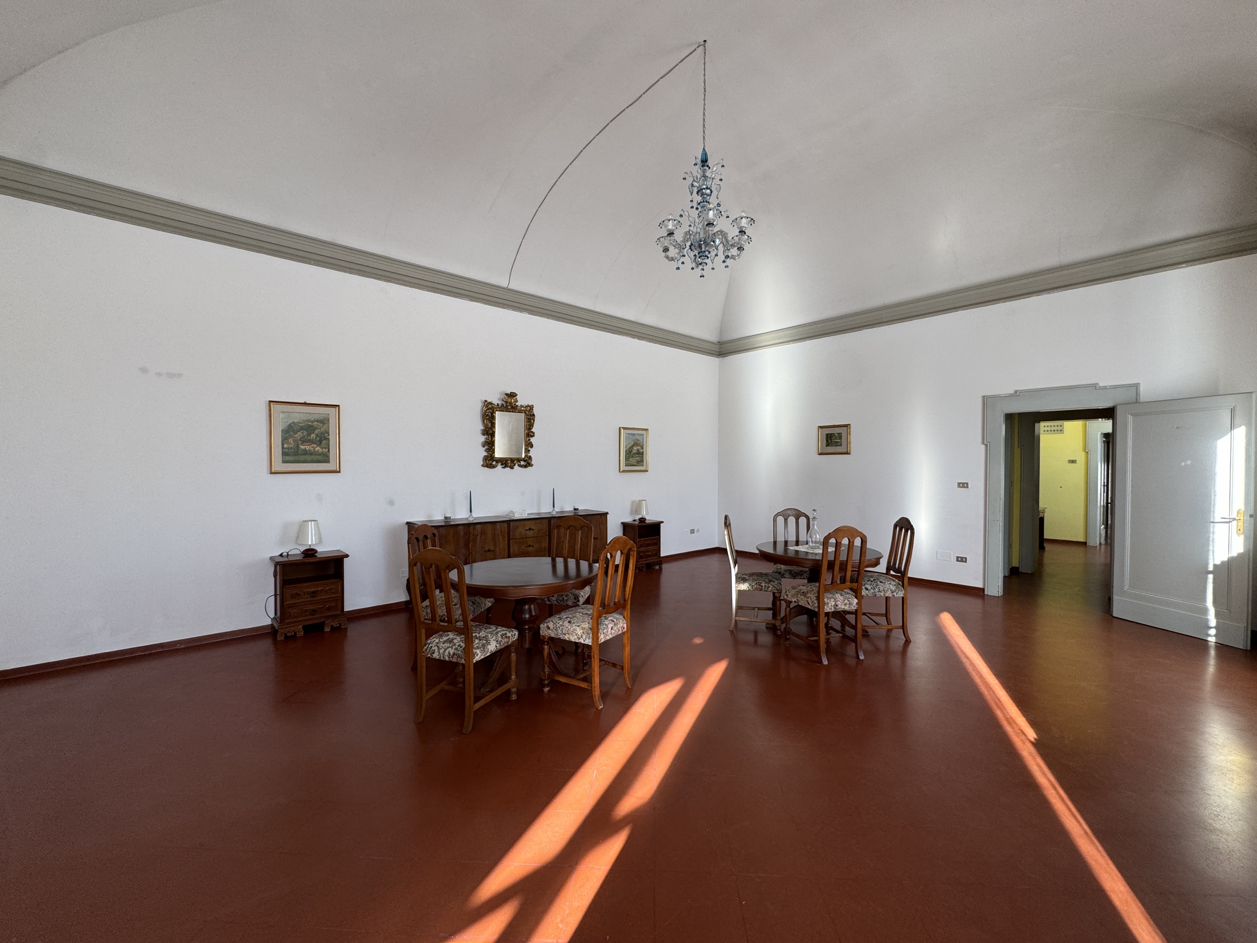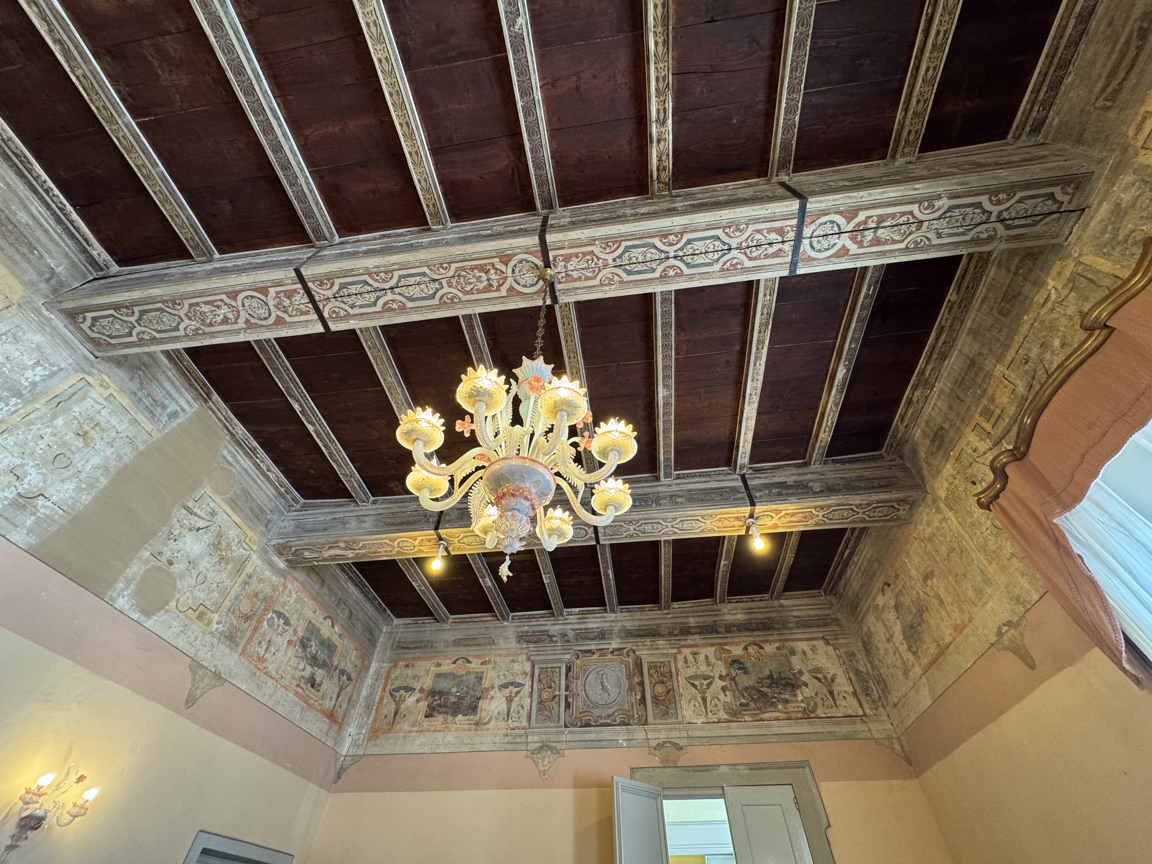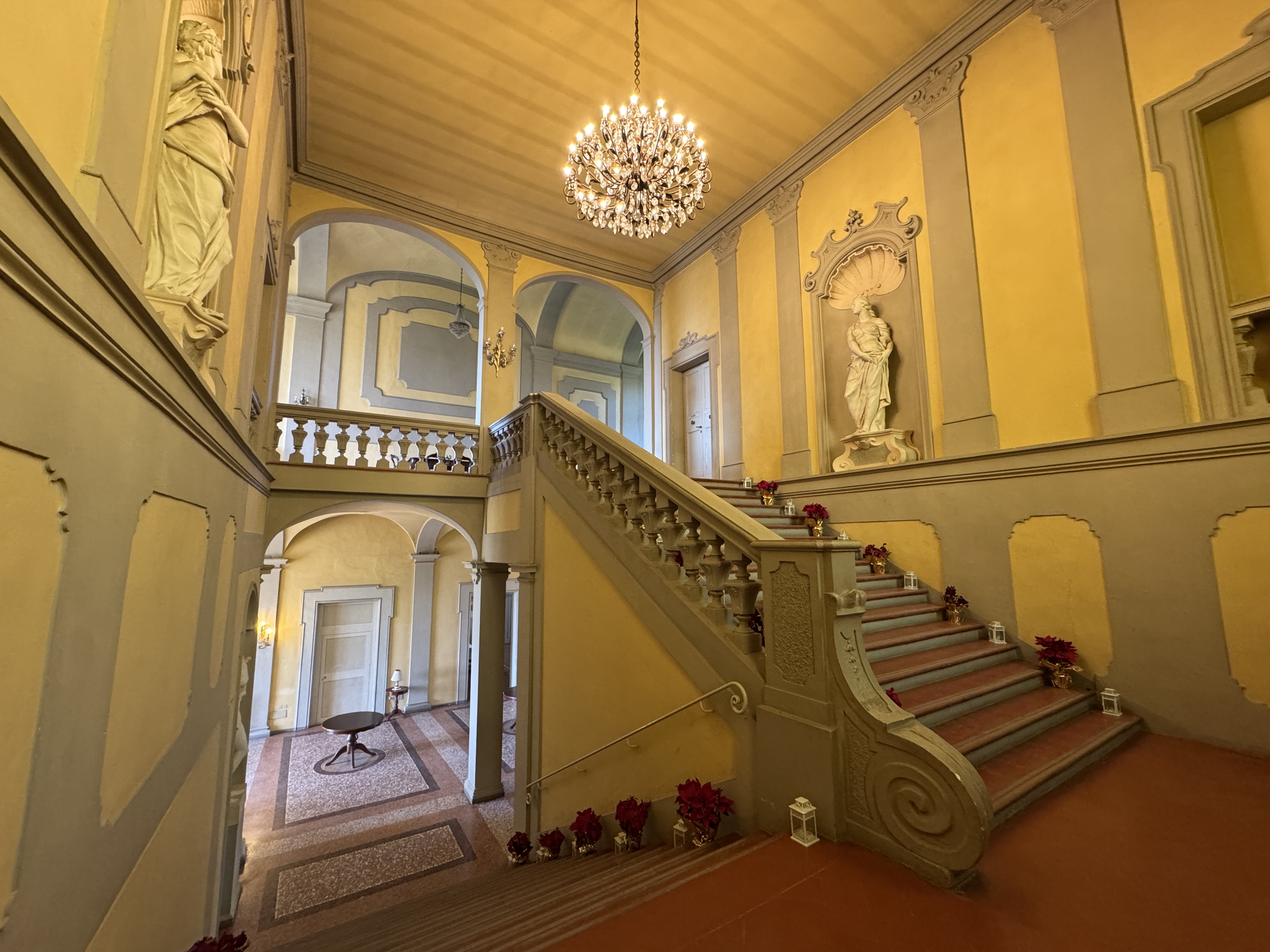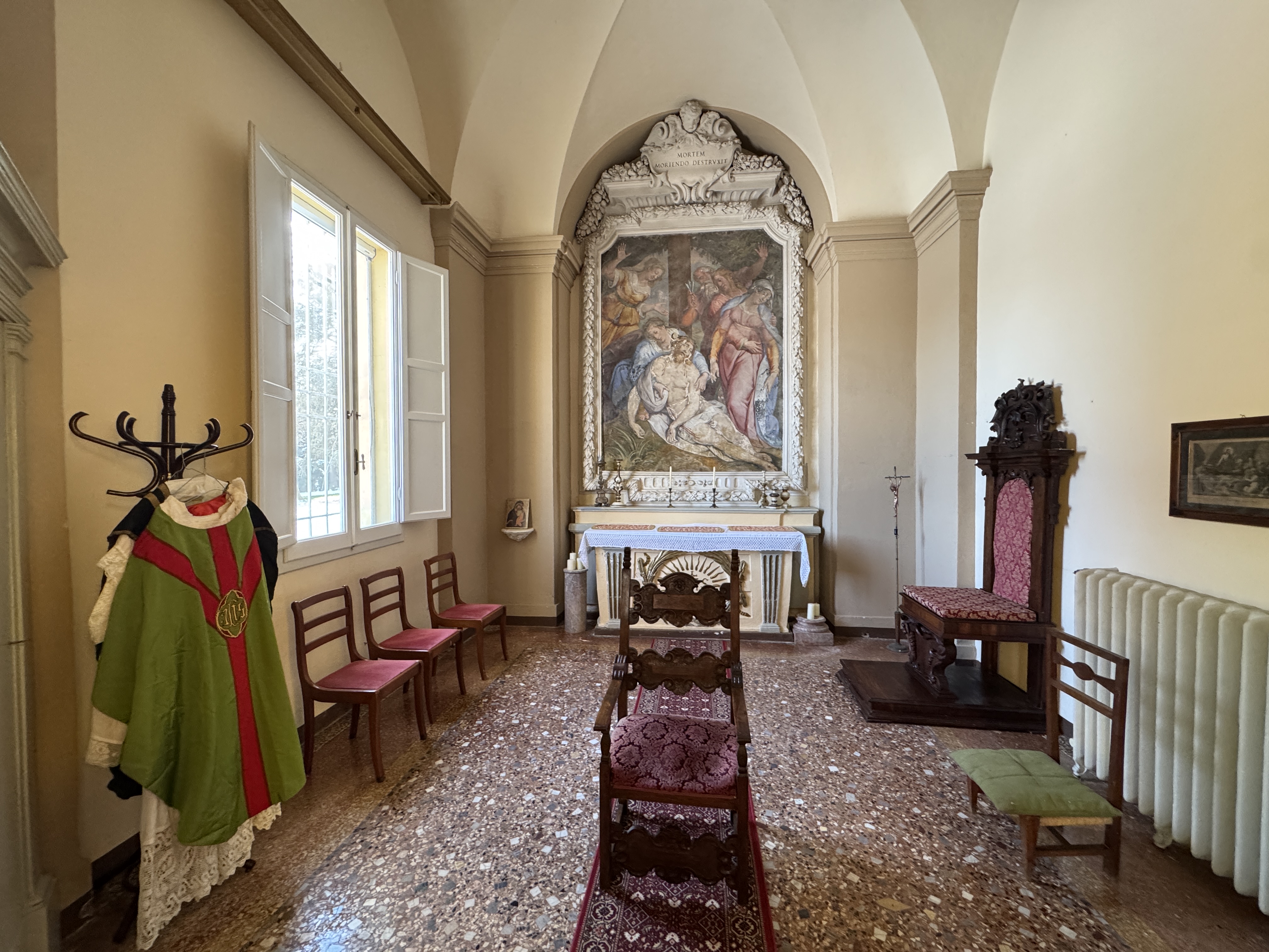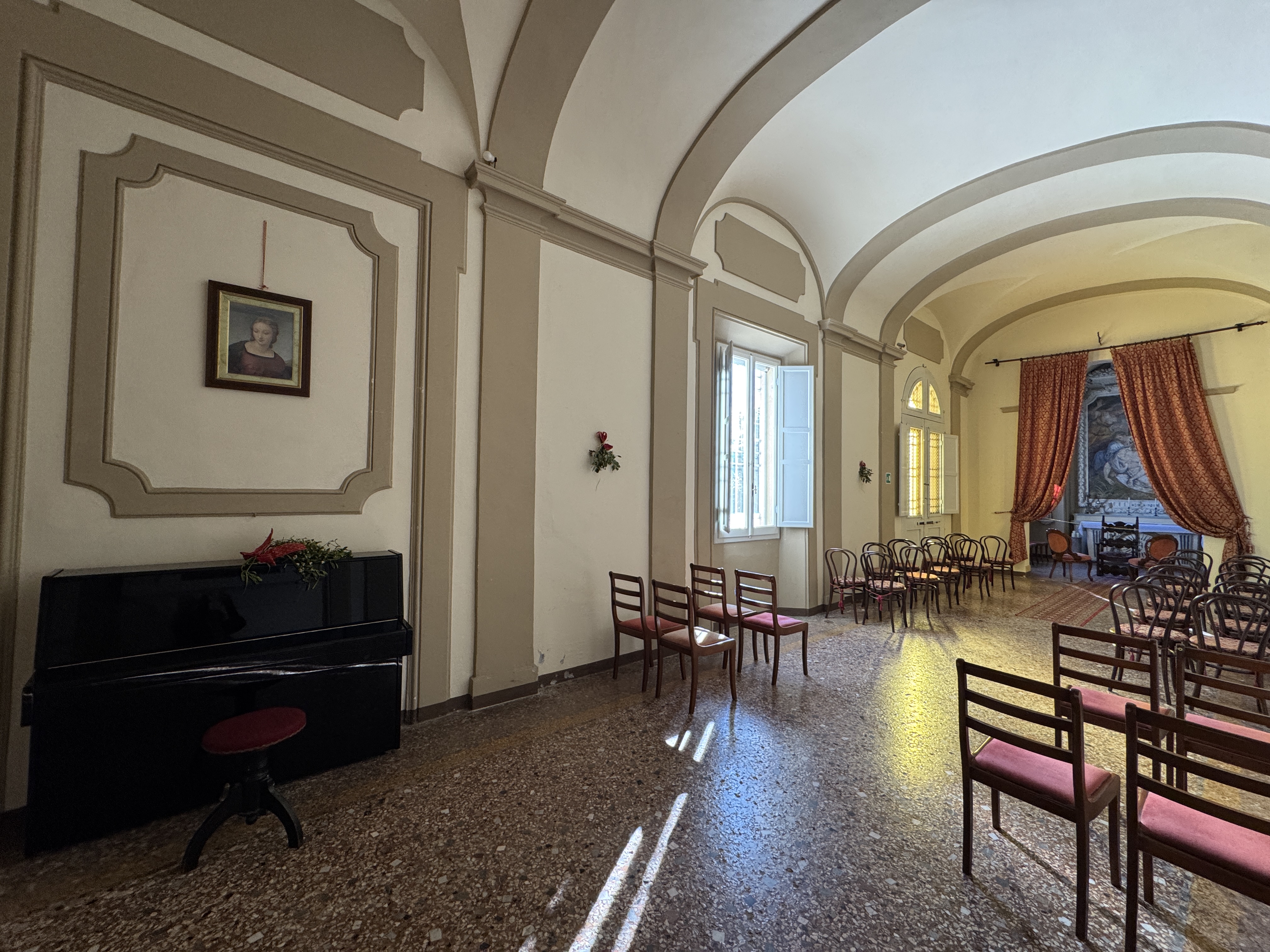 GLI INTERNI CONSERVANO AFFRESCHI, STUCCHI E APPARATI DECORATIVI ORIGINALI DI NOTEVOLE PREGIO. DI PARTICOLARE RILIEVO LA PRESENZA DI UNA CAPPELLA PRIVATA, IMPREZIOSITA DA UN DIPINTO MURALE ATTRIBUITO A CALVAERT, CHE CONFERISCE ALL’AMBIENTE UN’ATMOSFERA INTIMA E SOLENNE.
